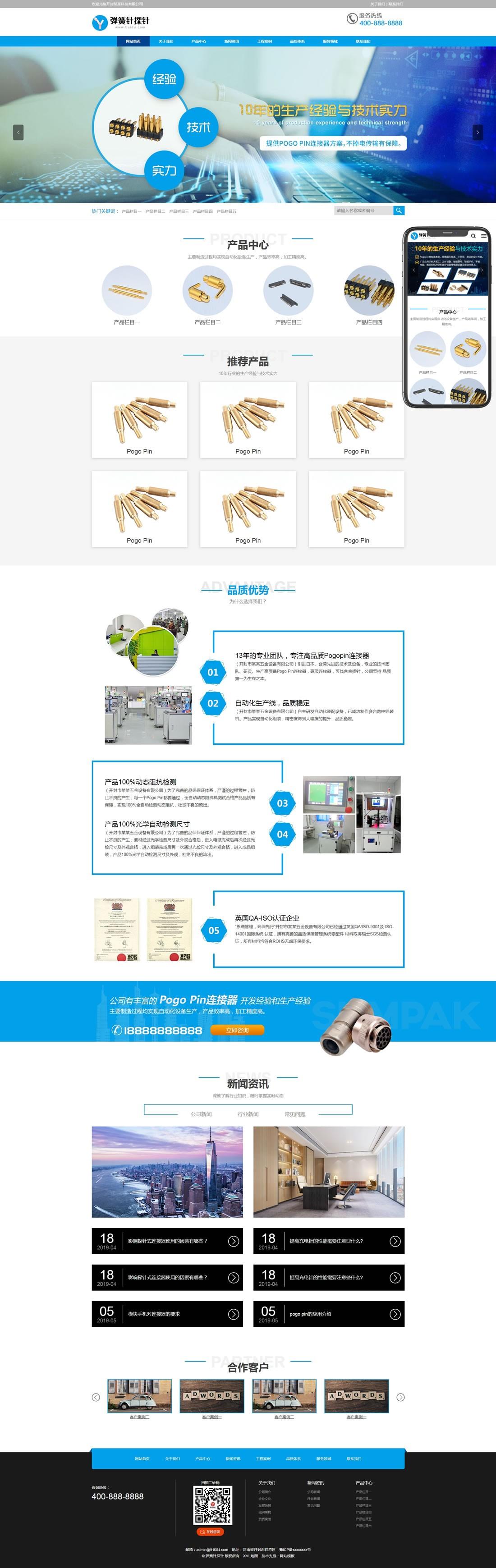 PbootCMS内核开发的网站模板,该模板适用于弹簧针、探针连接器等企业,当然其他行业也可以做,只需要把文字图片换成其他行业的即可;