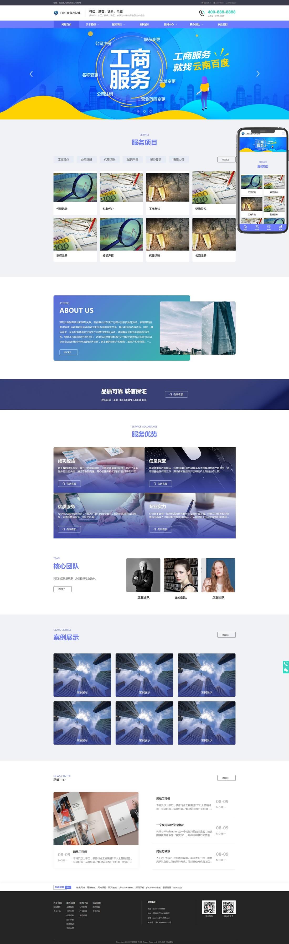 PbootCMS内核开发的网站模板,该模板适用于公司注册、财务会计等企业,当然其他行业也可以做,只需要把文字图片换成其他行业的即可;