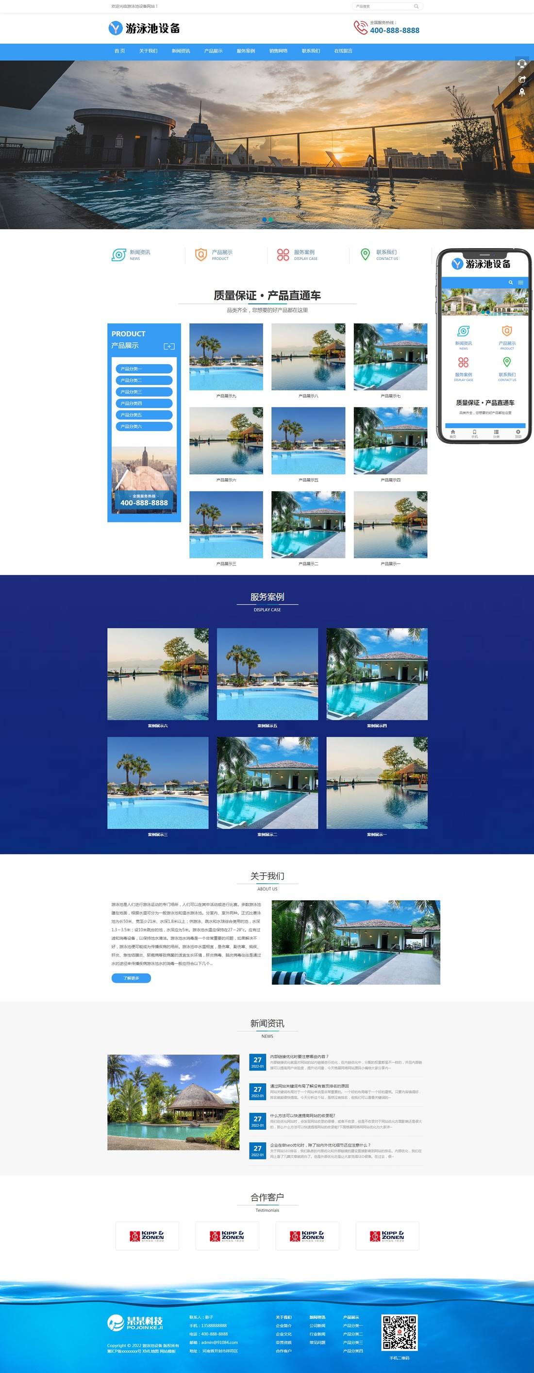PbootCMS内核开发的网站模板,该模板适用于游泳池设备、游泳馆设备等企业,当然其他行业也可以做,只需要把文字图片换成其他行业的即可;